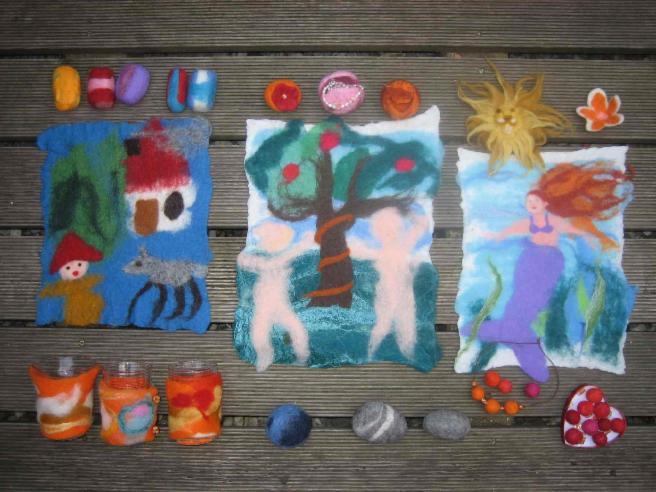 Sie können sich von meinen fertigen Filzbildern und der wunderbaren, kinderleicht zu filzenden, flauschigen Wolle inspirieren lassen. Es stehen uns eine große Farbauswahl mit vielen leuchtenden Farben zur Verfügung, die man miteinander mischen kann. Durch geduldiges Reiben mit warmer Seifenlauge verfilzt die gelegte Wollfläche und ein Bild entsteht. Sie können aber auch trocken (mit der Nadel) filzen.
